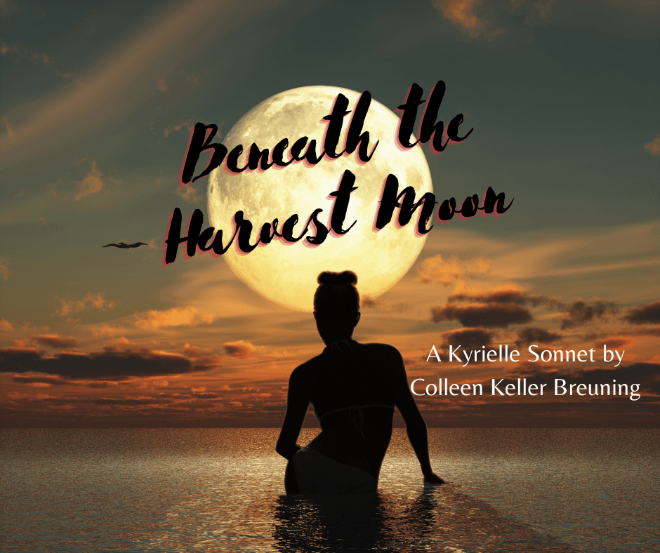 Beneath the Harvest Moon Autumn fires burn in golden sunOctober hues have come undone.As catbird sings his mournful tune,I wait beneath the harvest moon. Whisked on the wind, leaves are falling.Feel the chill of winter calling.Love comes not a moment too soon,I wait beneath the harvest moon. Your lips taste of cabernet wine,Sending chills runningContinue reading “Beneath the Harvest Moon”